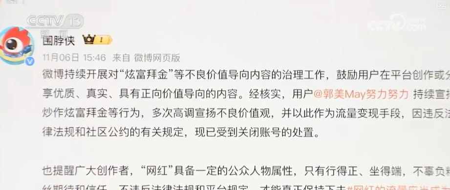 近日,激发社会关心。11月6日,微博账号发文称,用户“郭美May勤奋勤奋”持续炒做炫富拜金等行为,多次不良价值不雅,并以此做为流量变现手段,因违反法令律例和社区公约的相关,遭到封闭账号的措置。
